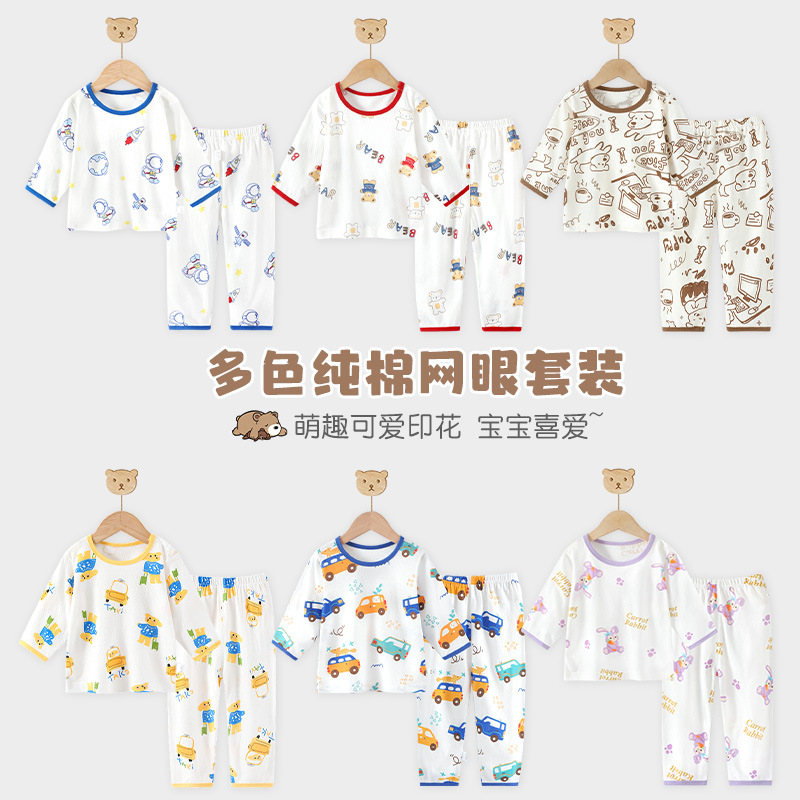 ملابس صيفية جديدة لتكييف الهواء المنزلي لعام 2024 طقم بيجامات أطفال قطنية رفيعة بأكمام طويلة للأولاد والبنات