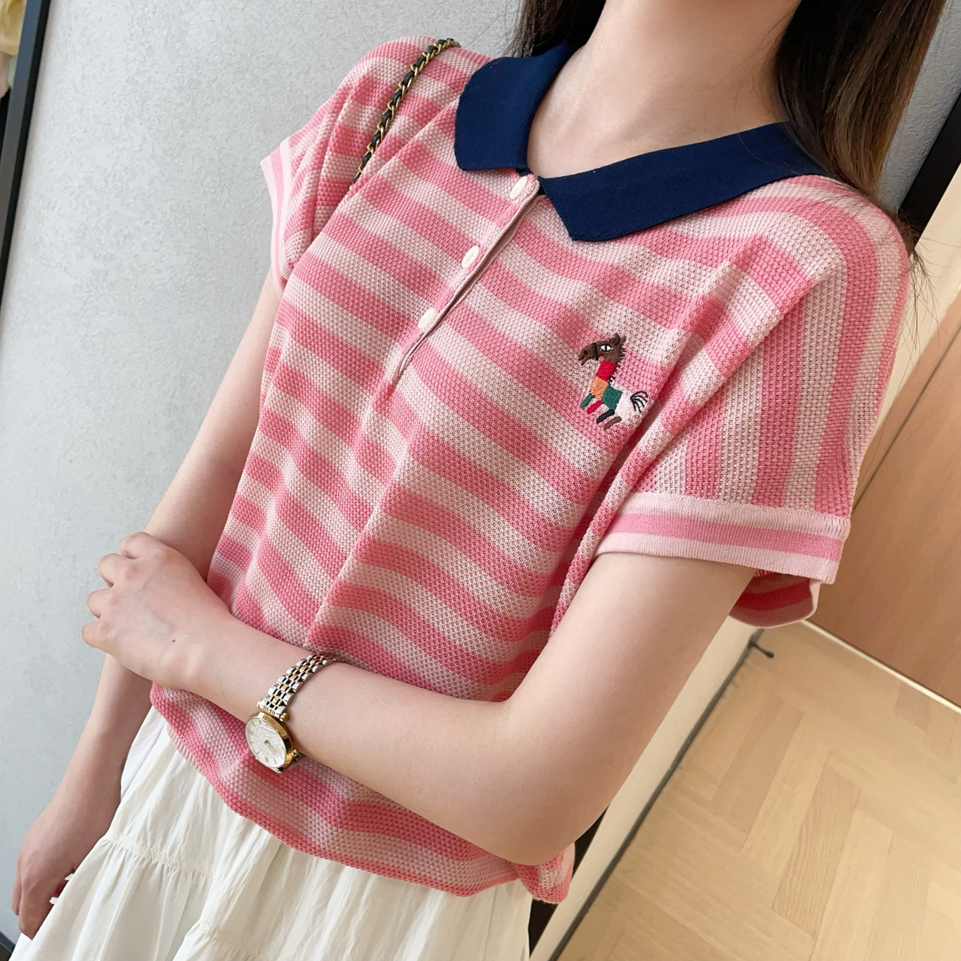Ju الأبيض كول ايوسل مخطط قميص بولو فضفاض التخسيس تحلق كم سترة المرأة صيف جديد F061306