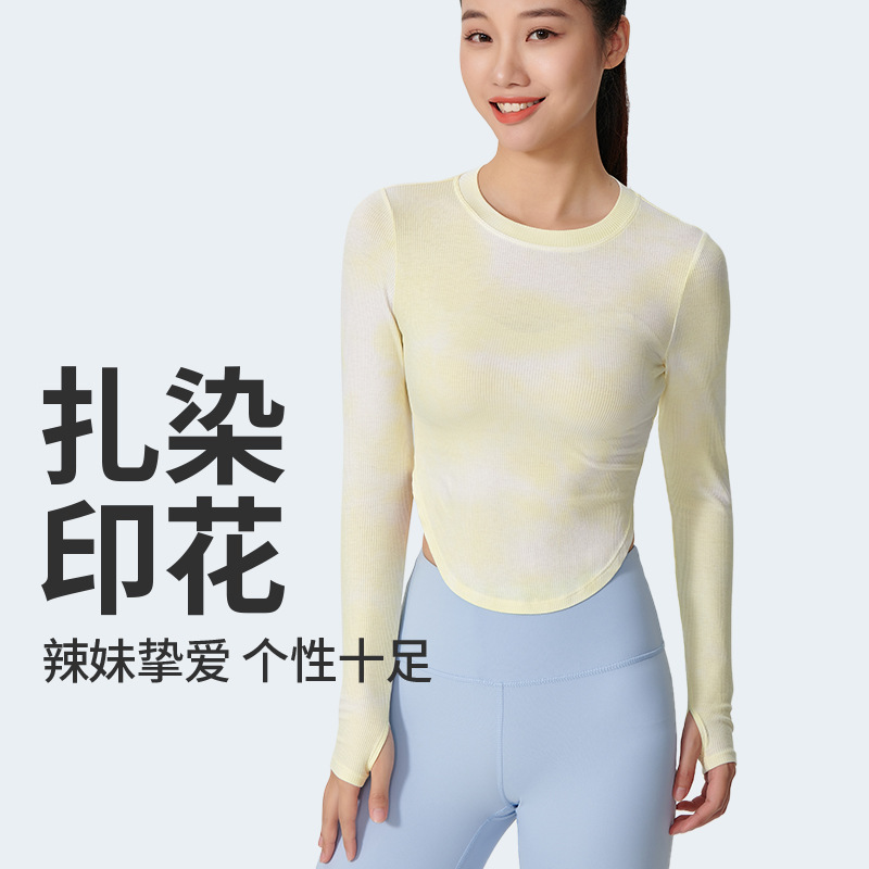 ملابس لياقة بدنية جديدة ضيقة قابلة للتمدد وسريعة الجفاف على الطراز الكوري وشق جانبي ضيق للتخسيس وربطة عنق مصبوغة وضلع يوجا بأكمام طويلة