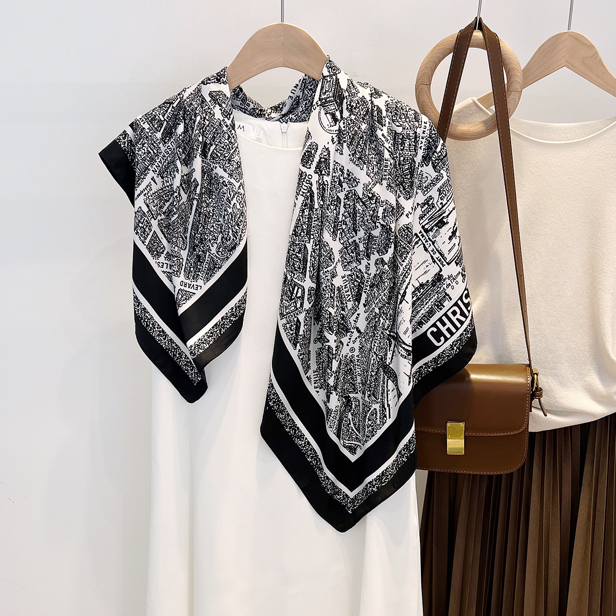 وشاح كلاسيكي أبيض وأسود مطبوع عليه خريطة مدينة باريس وشاح مربع مزخرف على الطراز الكوري وشاح ديكور أنيق وعصري