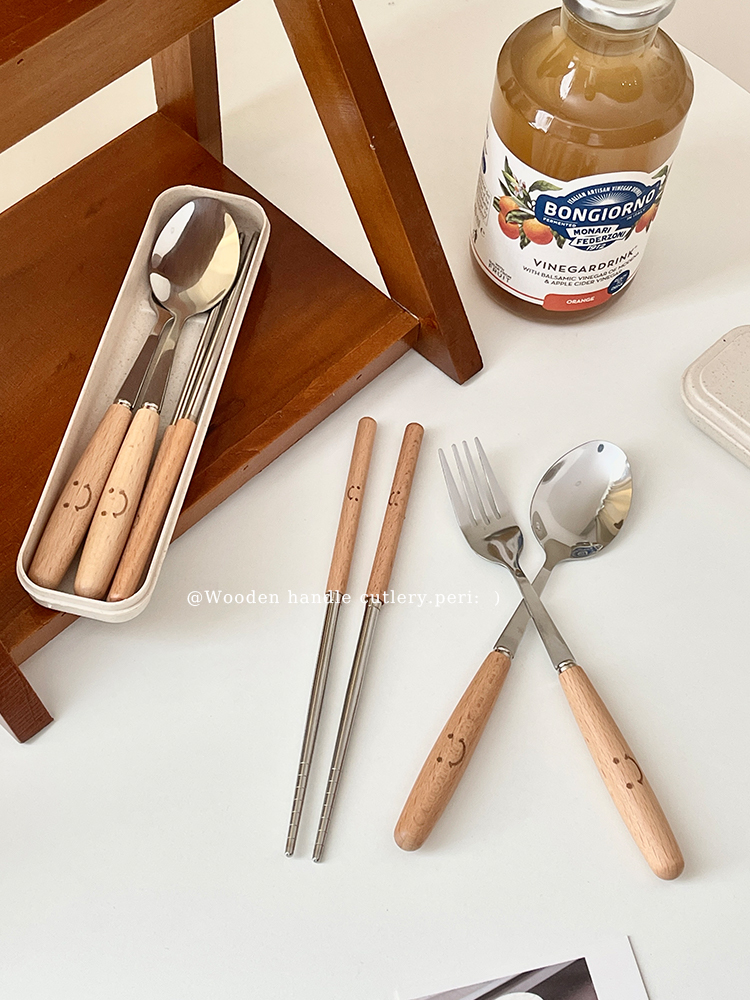 KF عيدان تناول الطعام ملعقة أدوات المائدة تناسب الطلاب الأطفال المحمولة عامل مكتب مقبض خشبي شوكة فولاذية مقاومة للصدأ مجموعة من ثلاث قطع واحدة