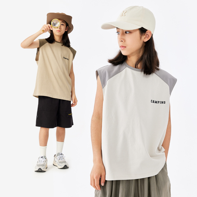 DK ملابس الأطفال 2024 صيف جديد جبل ريترو بنين بلا أكمام تي شيرت كبير للأطفال فضفاض اللون مطابقة سترة