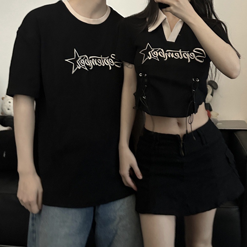 تي شيرت للزوجين ذو ياقة بولو قصيرة بتصميم كلاسيكي أمريكي جديد لصيف 2024 حلو وحار في الشارع