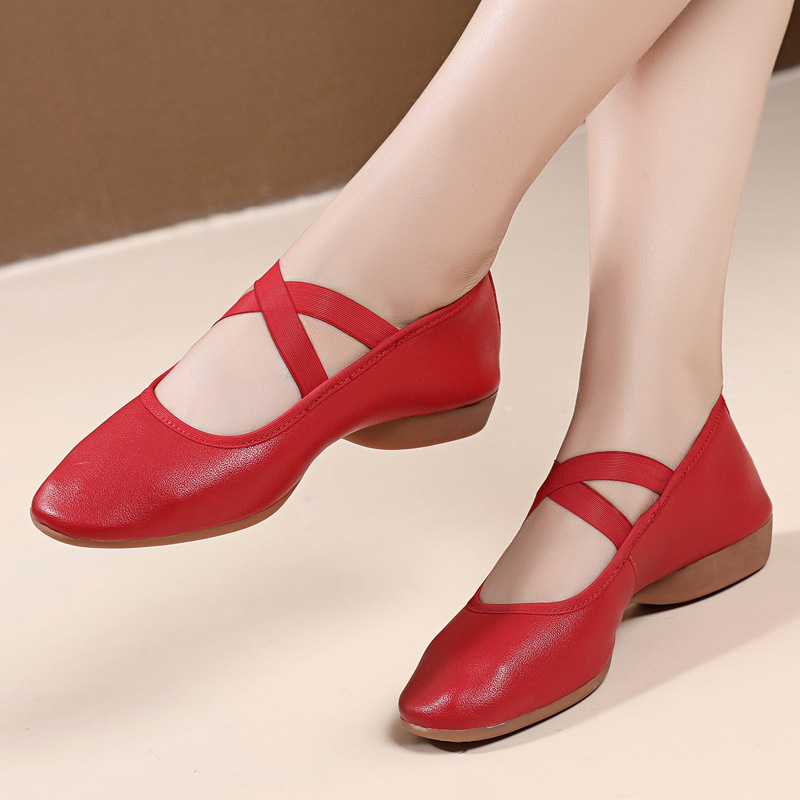 أحذية رقص مربعة من جلد البقر للنساء البالغات في منتصف العمر وكبار السن أحذية رقص نسائية ناعمة من الأسفل ونعل مطاطي أحذية رقص مربعة