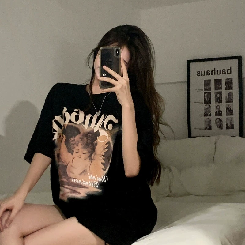 Tide Brand Print Black Retro Chic Hey Ins -Cuff T -shirt