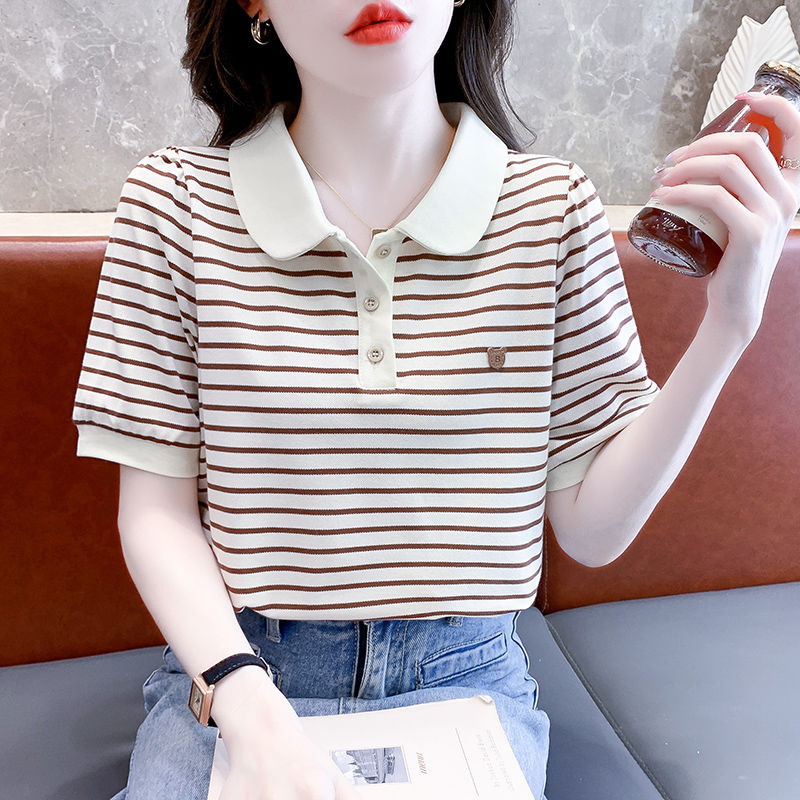 تي شيرت نسائي بأكمام قصيرة وياقة بولو مخططة للسيدات 2024 صيف جديد عصري أنيق يغطي البطن