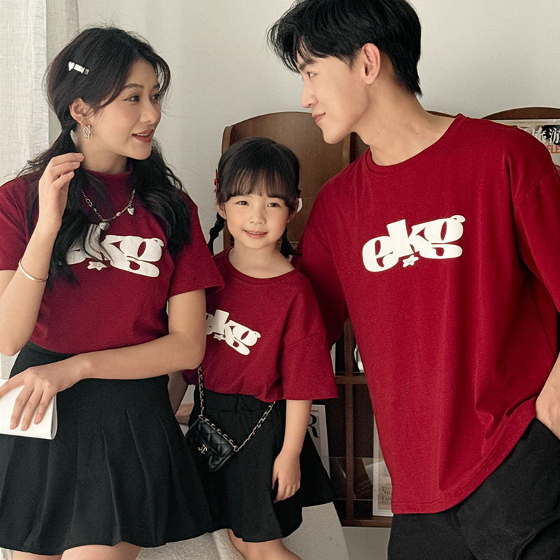 الرجعية الأمريكية نمط النبيذ الأحمر قصيرة الأكمام تي شيرت الوالدين والطفل ارتداء النمط الكوري النمط الغربي عارضة التخسيس الملابس النسائية المطبوعة نصف كم الأزياء T