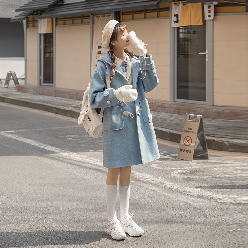 الخريف والشتاء النمط الكوري الجديد 2023 النمط الياباني للكلية فضفاض القرن مشبك منتصف طول معطف الصوف معطف مقنعين المرأة