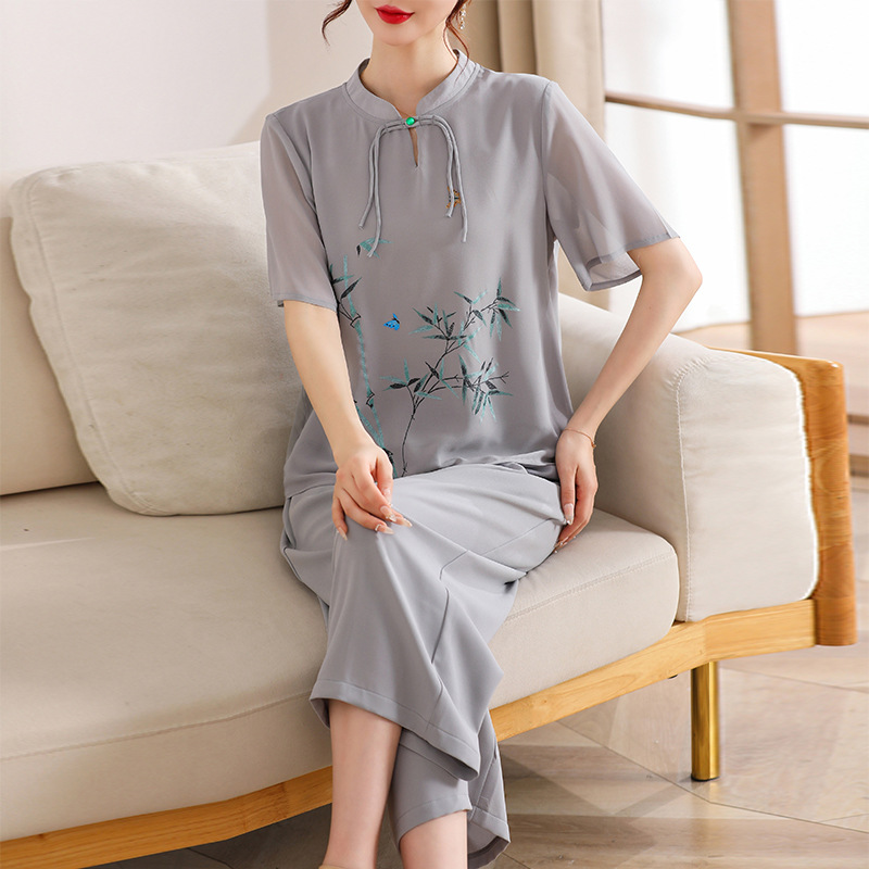 2024 جديد الأم الصيف قصيرة الأكمام الشيفون دعوى الأزياء قميص صغير النمط الغربي أعلى منتصف العمر وكبار السن تي شيرت قطعتين مجموعة