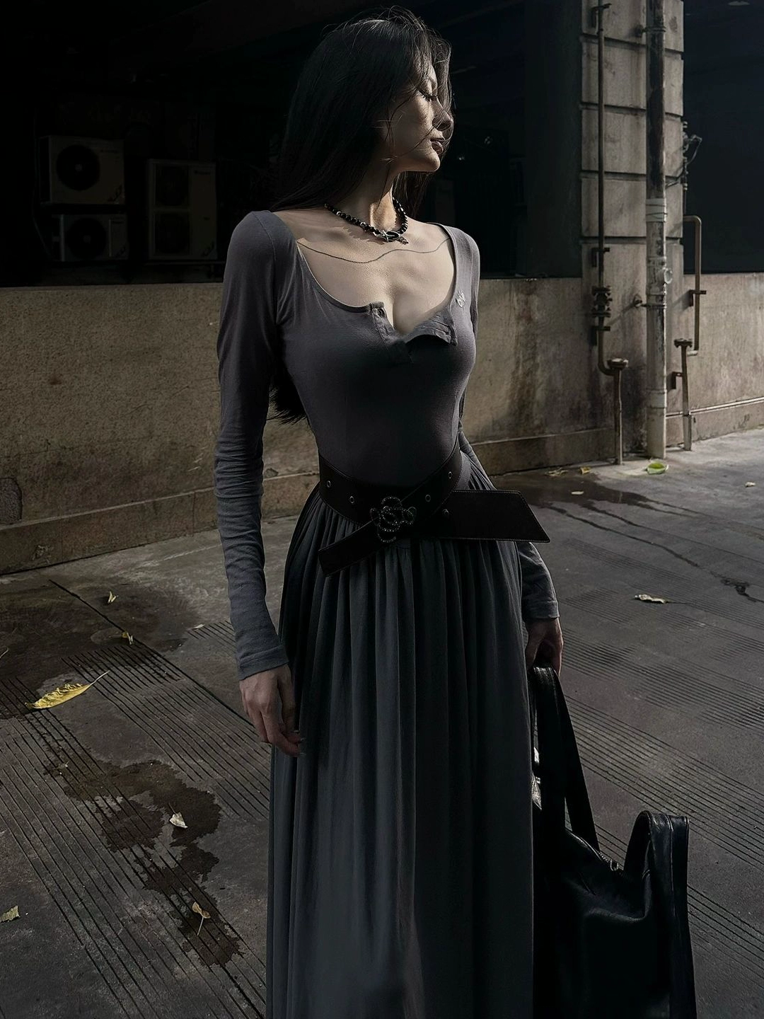 تنورة أمريكية ذات فتحة عالية الخصر ومتوسطة الطول باللون الرمادي