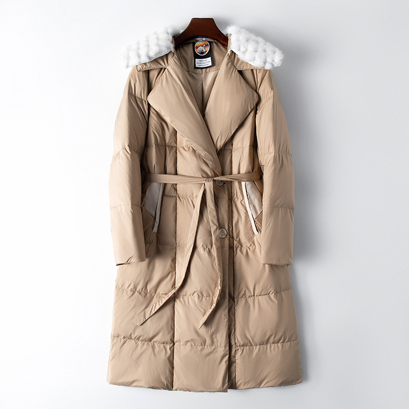 سترة جديدة طويلة بيضاء من ريش الأوز متوفرة في المصنع لربيع وخريف 2024 معطف نسائي بياقة كحلية من الدانتيل وأسفل الأوز