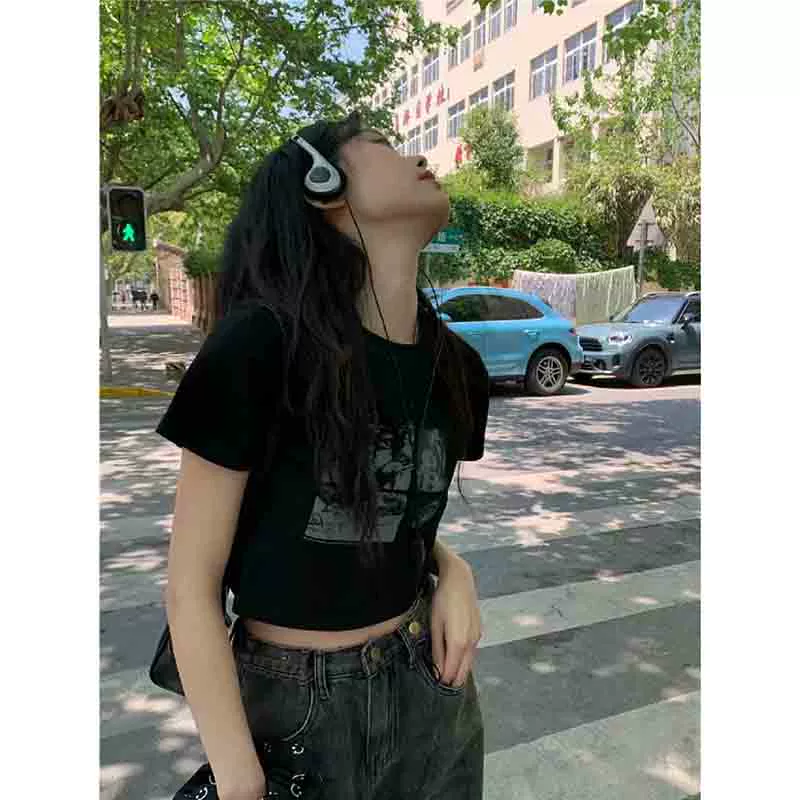 الكتف الأمامي قصير الأكمام تي شيرت أمريكان رجعية الساخنة الفتاة