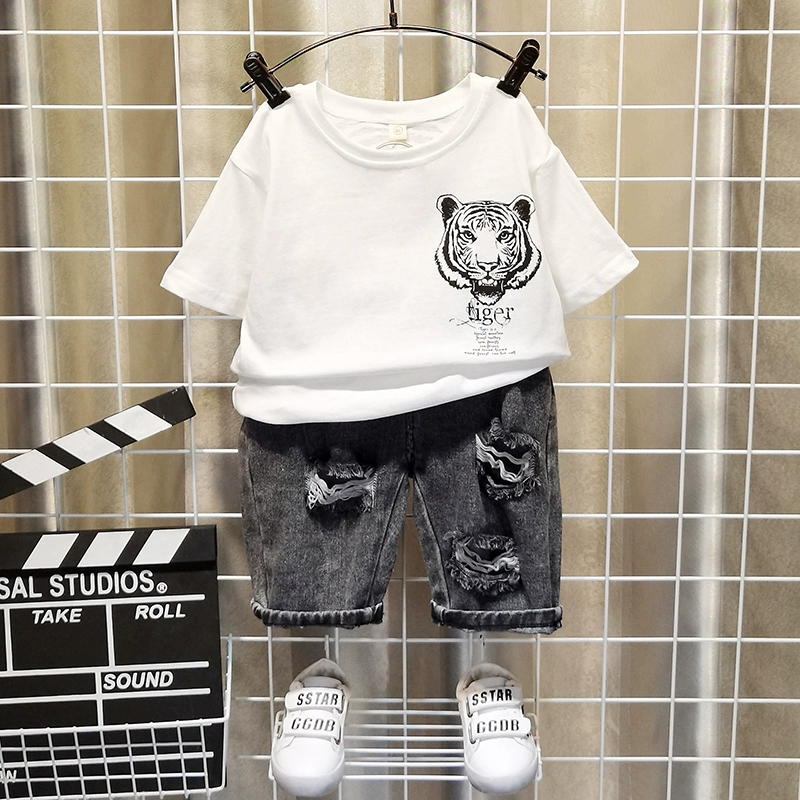 لباس الأطفال الصغير الأولاد بدلة صيفية 2025 جديدة وسيم شارع مقلي نسخة كورية من الجينز القصيرة