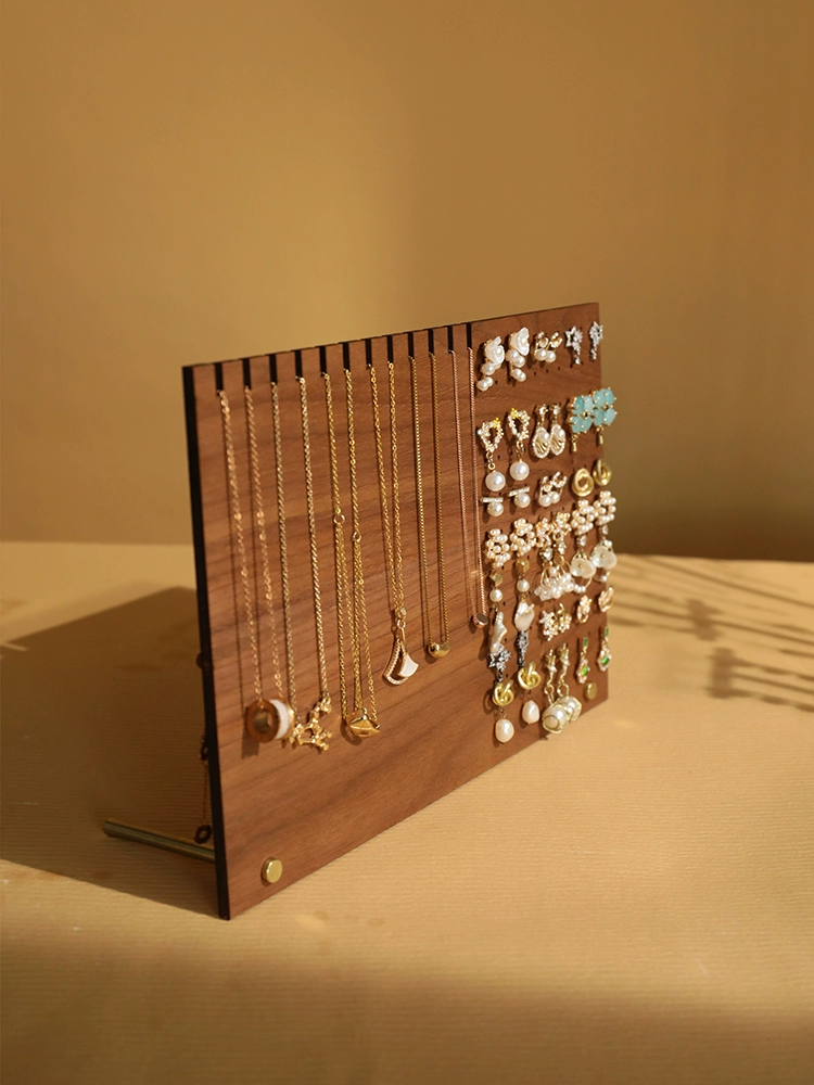 رف عرض المجوهرات من خشب الجوز وحلق وقلادة ورف تخزين المجوهرات وعرض المجوهرات وديكور دعائم التصوير الفوتوغرافي