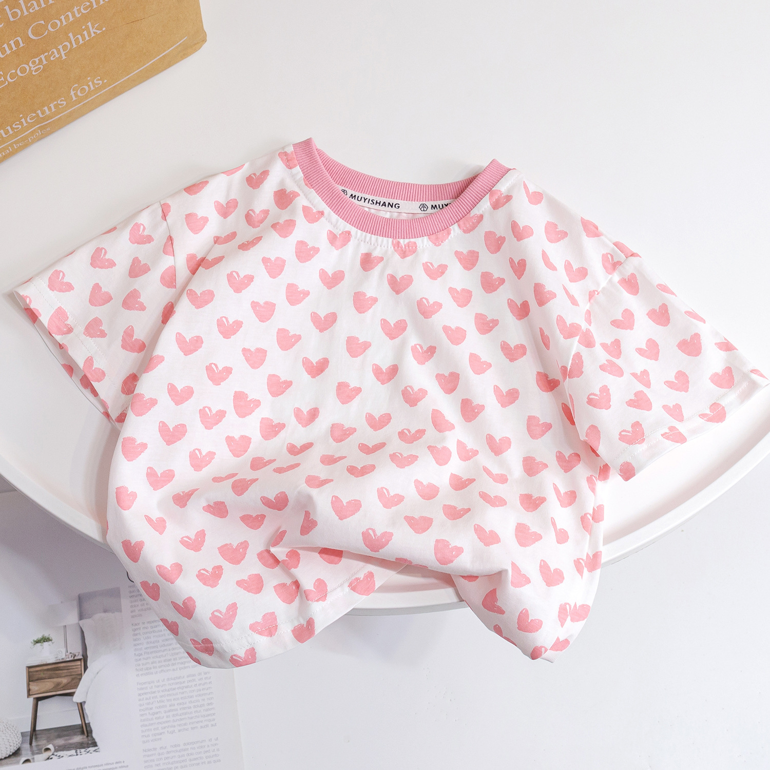 تي شيرت بناتي بأكمام قصيرة 2023 وصل حديثًا لصيف 2023 ملابس صيفية أنيقة للفتيات على شكل قلب للأطفال نصف كم قميص عصري يناسب الجميع