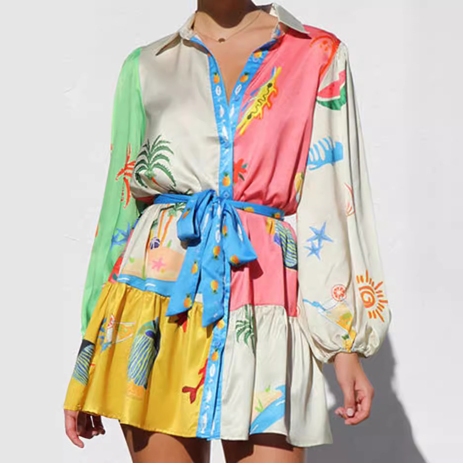 ملابس نسائية أوروبية وأمريكية عبر الحدود 2024 صيف جديد موضة غير رسمية طية صدر السترة مطبوعة فستان دانتيل الترفيه الياباني والكوري