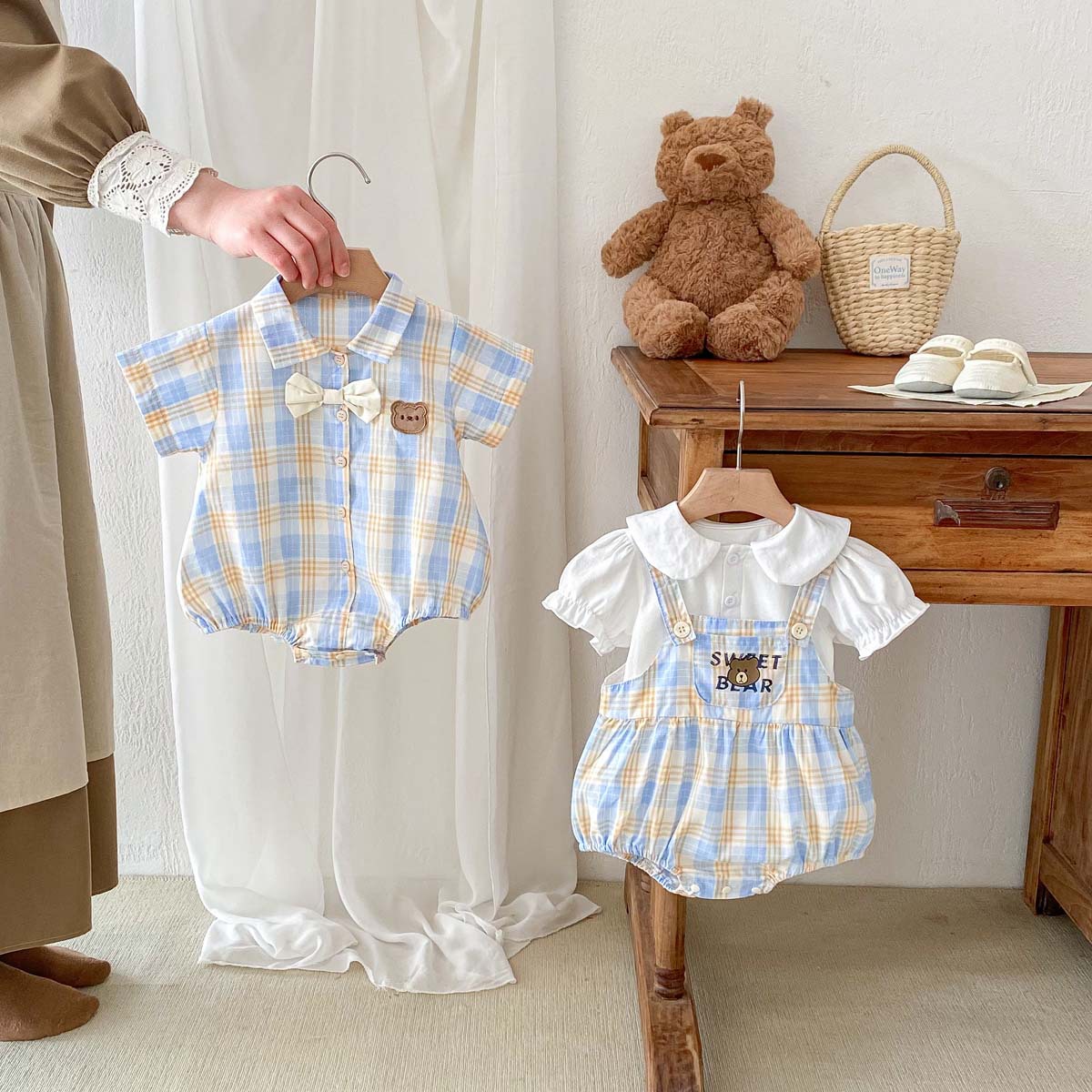 ملابس أطفال هاربر صيفية للرجال لعام 2024 ملابس أطفال لطيفة على شكل دب منقوشة بأكمام قصيرة من قطعة واحدة ملابس هاربر للأخ والأخت