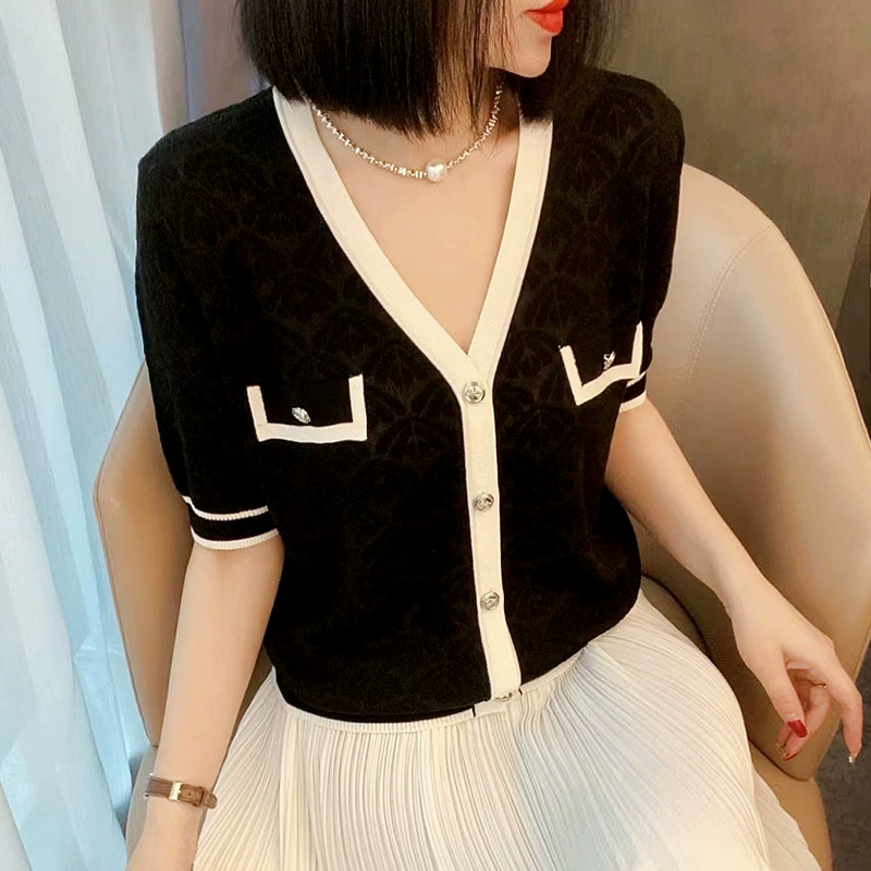 سترة Xiaoxiangfeng بجيب وأزرار معدنية ورقبة على شكل حرف V وأكمام قصيرة