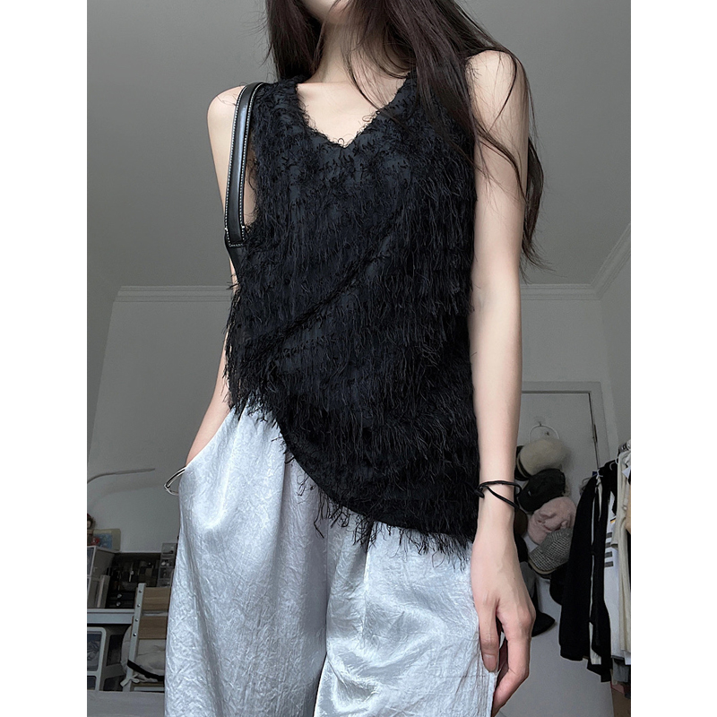 سترة بتصميم شرابة من الريش بدون أكمام ورقبة على شكل حرف V