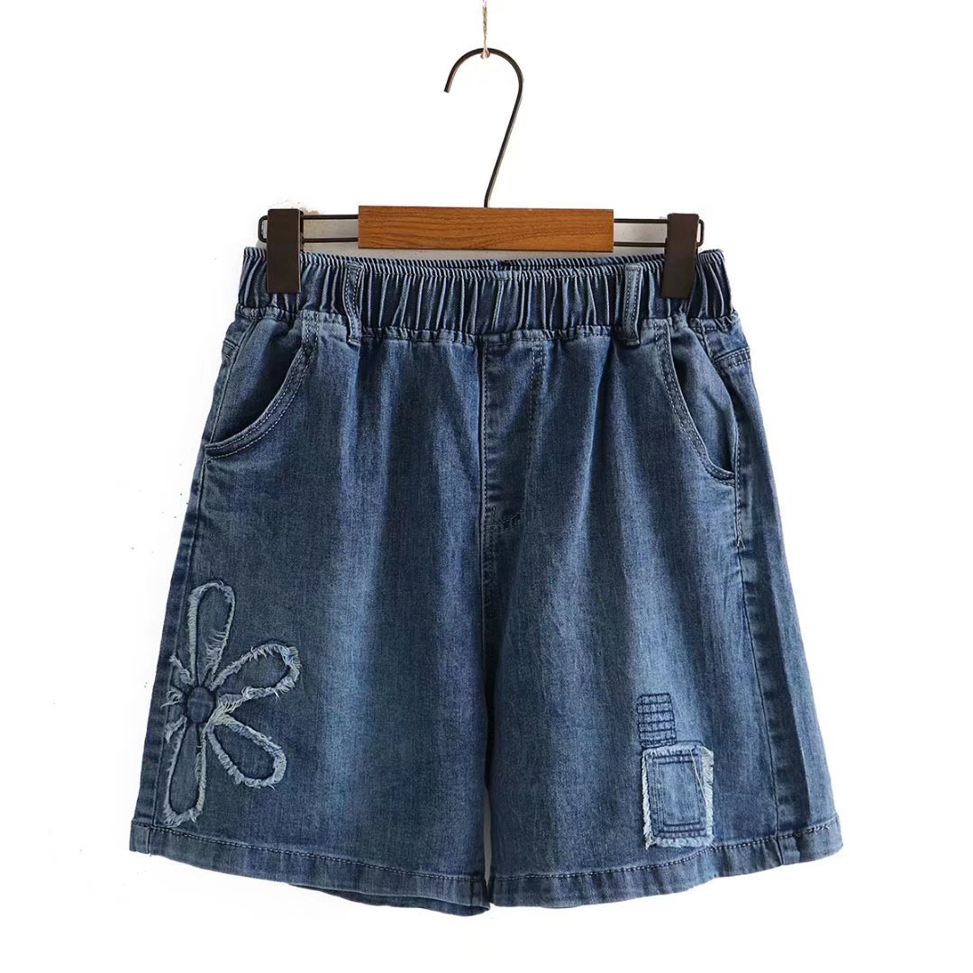 K75 السمين MM حجم كبير المرأة الصيف موضة جديدة الفني الرجعية المطرزة ايوسل الدينيم واسعة الساق السراويل 019