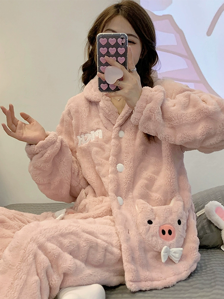 بيجامة شتوية نسائية مخملية مرجانية بأكمام طويلة بالإضافة إلى مخمل سميك لطيف من الفلانيل على الإنترنت طقم ملابس منزلية على طراز المشاهير