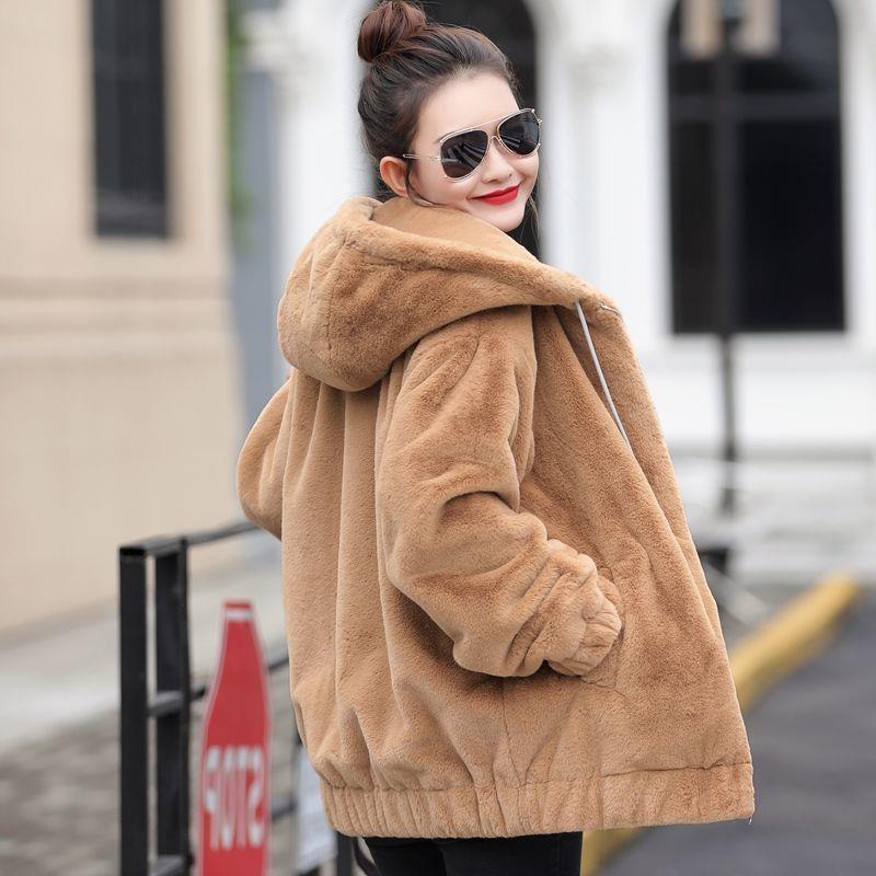 معطف بقلنسوة من فرو الأرنب الصناعي السميك مبطن بالصوف للنساء متوسط الطول 2023 شتاء جديد على الطراز الكوري ملابس فضفاضة بأكمام طويلة للنساء