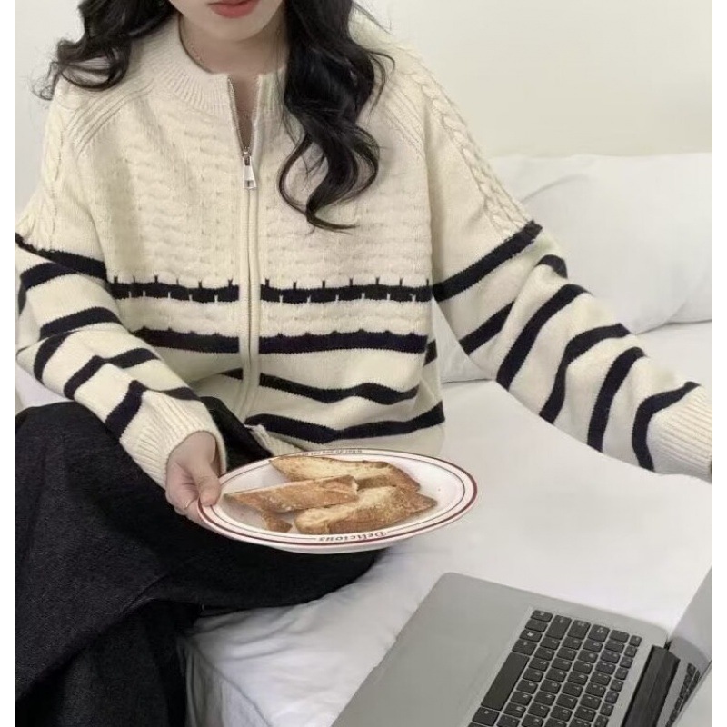 2024 أوائل الخريف والشتاء بسيط مخطط التباين اللون مزدوجة سستة قصيرة سترة مشغولة من الصوف المرأة فضفاضة كل مباراة سترة بأكمام طويلة