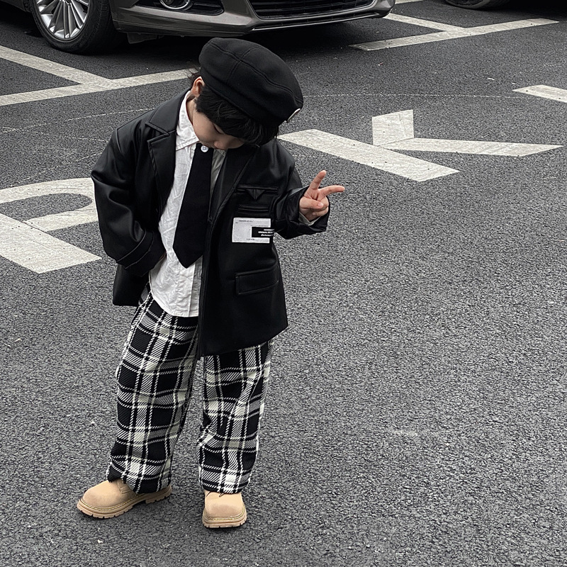 بدلة جلدية للأطفال 2023 خريف وشتاء جديد للأولاد ناعمة من البولي يوريثان على الطراز الكوري بدلة صغيرة عصرية وسيم تسليم قطعة واحدة