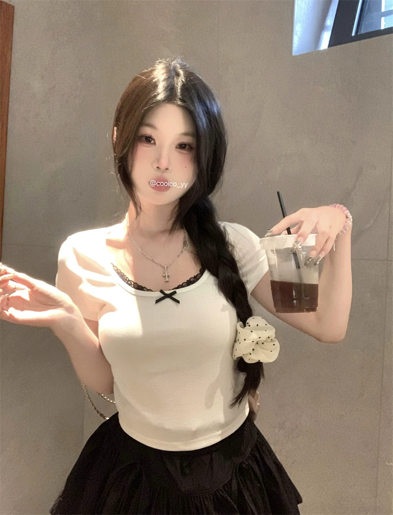 المرأة المرقعة قصيرة الأكمام الصيف تصميم الأزياء الدانتيل