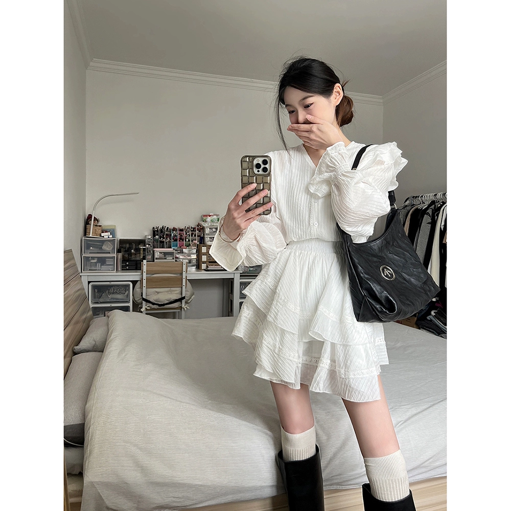طقم أزياء قميص أبيض مكشكش بياقة على شكل حرف V وأكمام طويلة