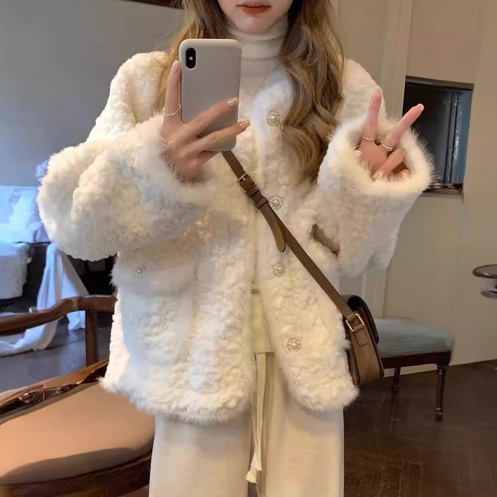 معطف شانيل ستايل للنساء 2023 جديد من فرو الضأن تقليد فرو الأرانب فضفاض للتنحيف دافئ عالي الجودة من القطيفة