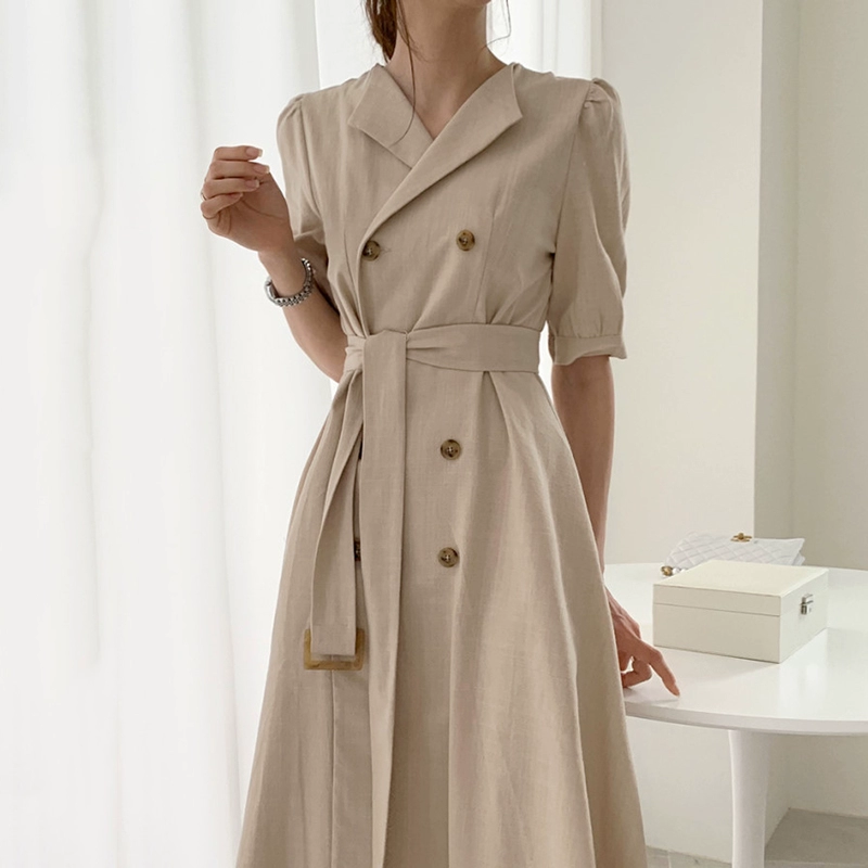 تنورة بدلة رفيعة مزدوجة الصدر على الطراز الكوري من القطن والكتان بتصميم كلاسيكي