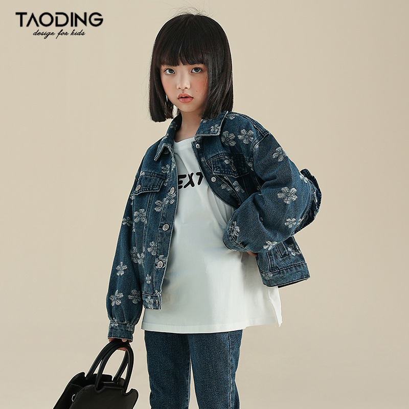 سترة دنيم جديدة للفتيات لربيع وخريف 2023 ملابس كبيرة للأطفال على الطراز الغربي سترة عصرية جاكار من قماش الدنيم للأطفال
