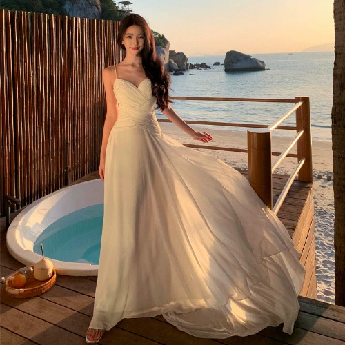 فستان شاطئ بوهيمي من الشيفون بدون ظهر على شاطئ البحر