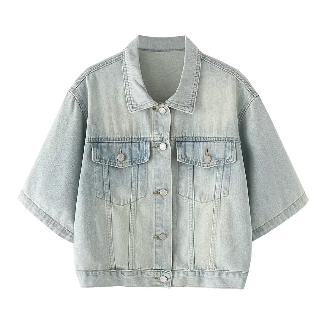 سترة نسائية صيفية جديدة أوروبية وأمريكية من قماش الدنيم فضفاضة بأكمام قصيرة W23735