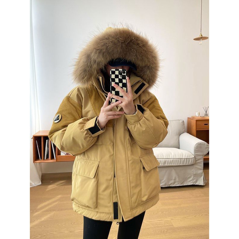 ملابس عمل للزوجين سترة بيضاء مبطنة للنساء 2024 جديدة متوسطة الطول سميكة وياقة شعر كبيرة للتغلب على معطف الشتاء
