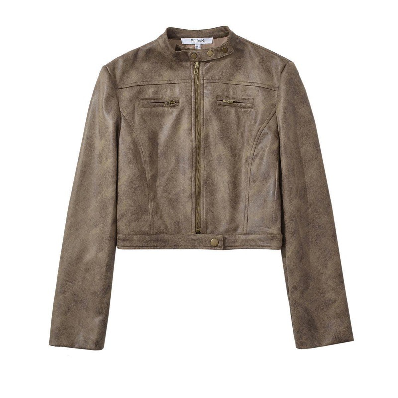 23 سترة نسائية جديدة لفصل الربيع والخريف سترة قصيرة كلاسيكية أوروبية مثيرة للفتيات ذات ياقة نحيفة معطف دراجة نارية من جلد الأيل المقلد