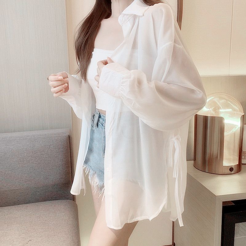 قميص شيفون أبيض واقي من الشمس صيفي بأكمام طويلة ملابس خارجية سترة رفيعة للغاية ملابس واقية من الشمس سترة نسائية على الموضة ملابس واقية من الشمس على الطراز الغربي