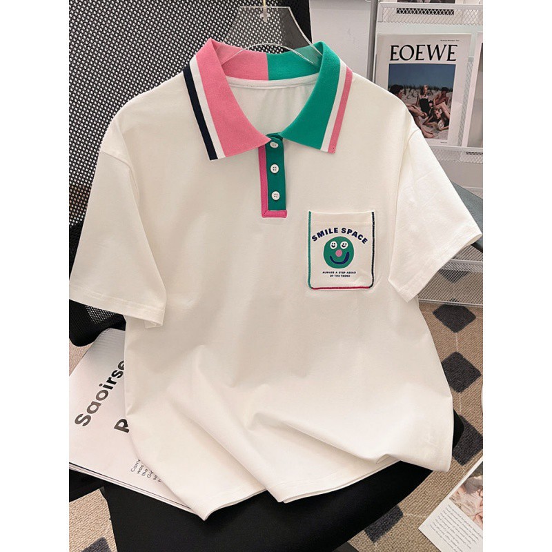 قميص بولو للفتيات صيفي بأكمام قصيرة وطية صدر السترة على الطراز الجامعي على الطراز الكوري فضفاض جديد يناسب الجميع توب بناتي عصري