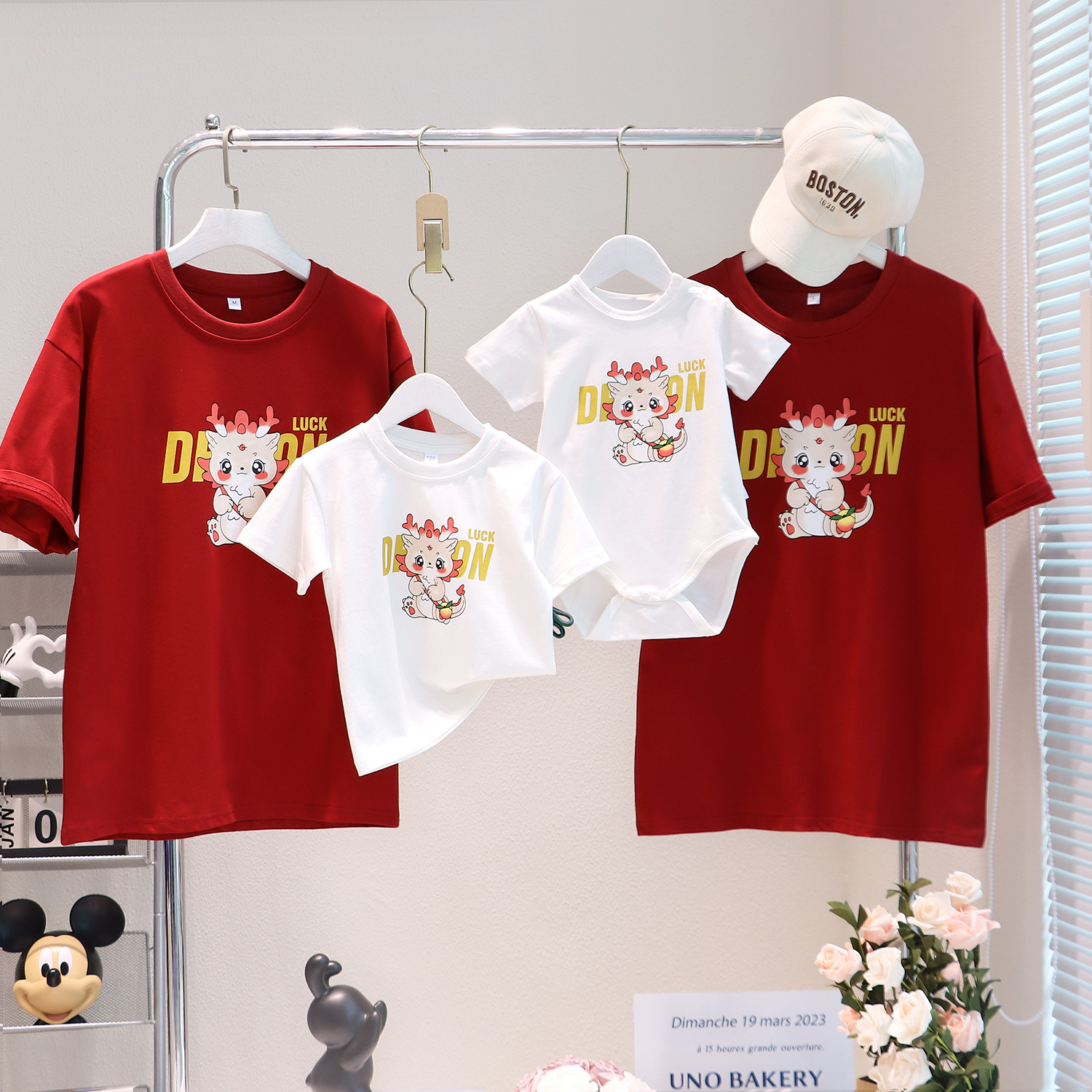 تي شيرت جديد لربيع وصيف 2024 للوالدين والطفل لعائلة مكونة من أربعة وثلاثة تنين سنة طفل مائة يوم مأدبة الأم والابنة الأم والطفل بأكمام قصيرة
