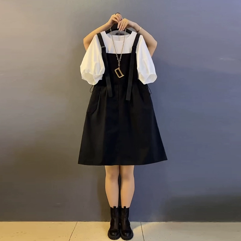 قميص القميص الدهني حزام عاجل تنورة على الطراز الكوري الأكمام القصير