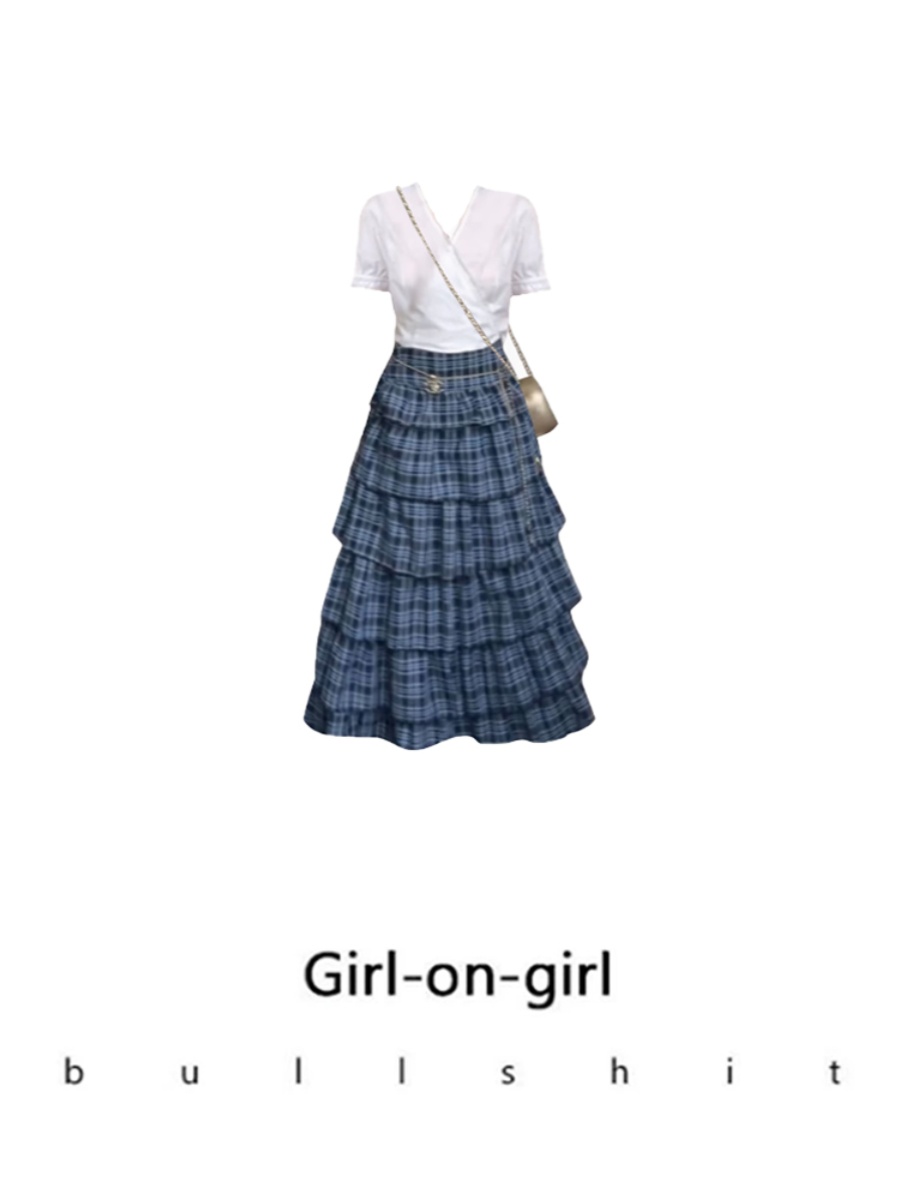 بقعة البضائع! قميص فرنسي أبيض منتفخ بأكمام قصيرة للنساء تصميم صيفي تنورة منقوشة عالية الخصر طقم مكون من قطعتين