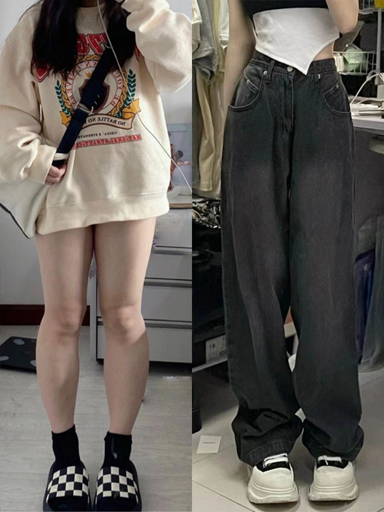 الربيع والخريف الجينز الرمادي الدخاني المرأة مستقيم ارتفاع الخصر بالإضافة إلى حجم فتاة السمين على شكل الكمثرى الدهون قليلا فتاة ارتداء السراويل واسعة الساق