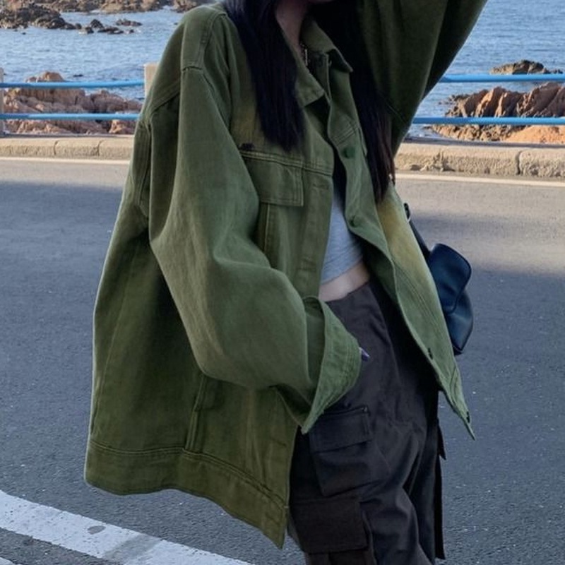 معطف الدنيم المرأة هونغ كونغ نمط الرجعية ملابس العمل الربيع والخريف تصميم جديد حس النمط الأمريكي التدرج كم طويل سترة علوية