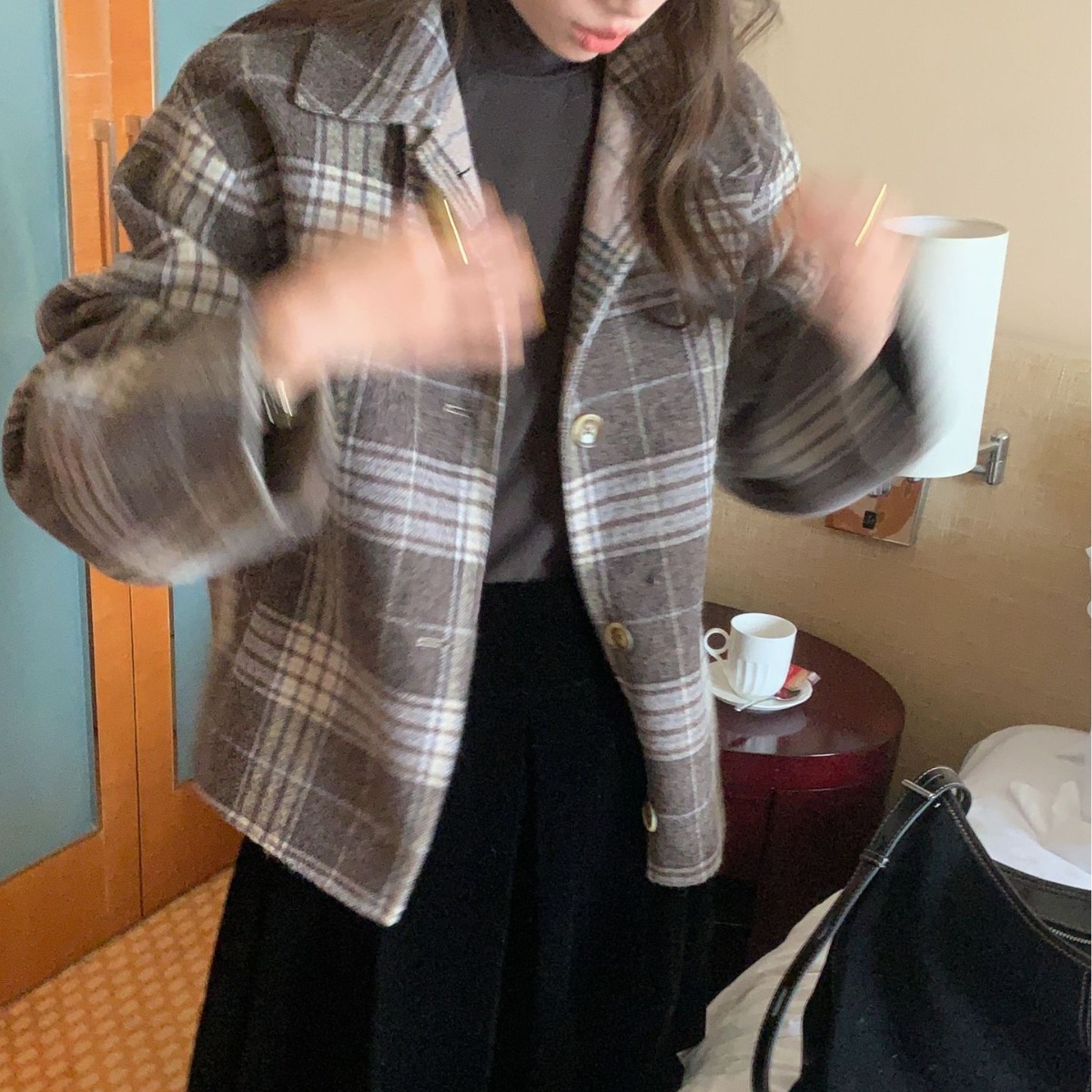 الآن 2023 شتاء جديد كوريا الجنوبية Dongdaemun فضفاضة طية صدر السترة غير رسمية واحدة الصدر التباين اللون منقوشة معطف الصوف للنساء