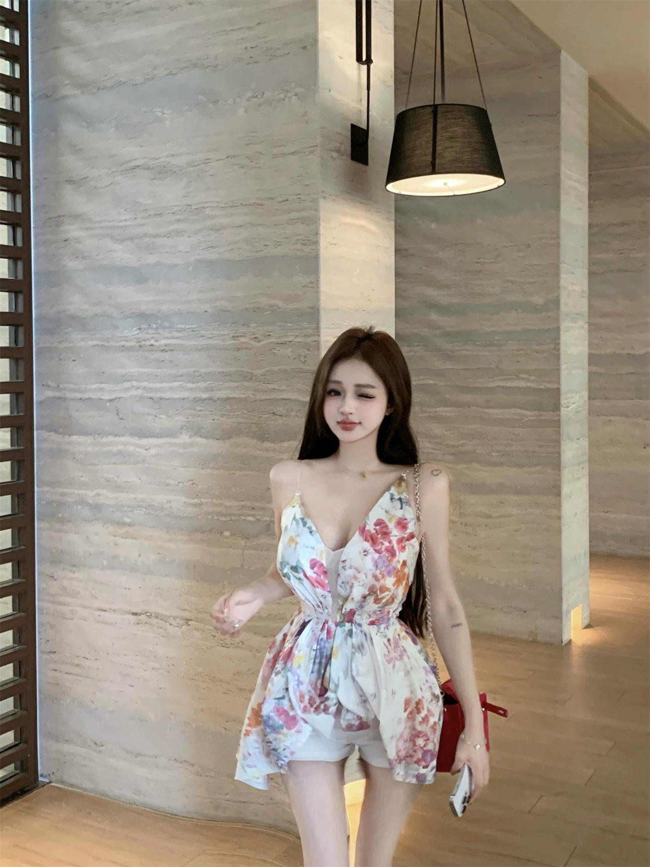 فستان صيفي موديل 2024 مُزين بنقشة الزهور على شكل حرف v فرنسي على الطراز الكوري أنيق بقصة ضيقة وأكمام فقاعية من الشيفون سبليت