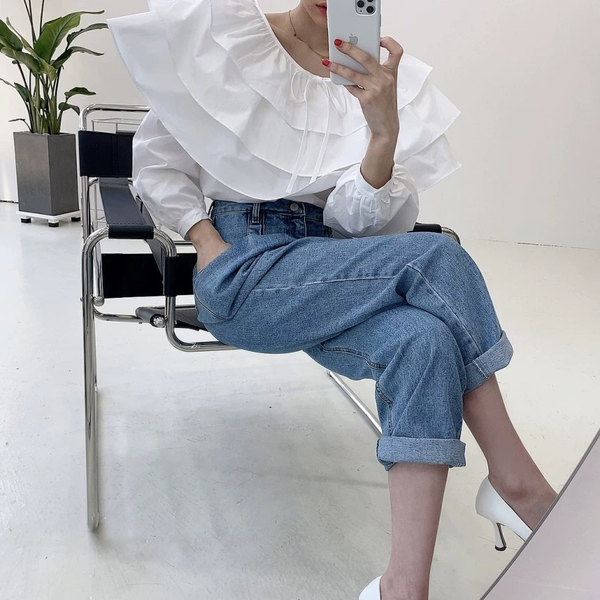 كوريا الضغط الرجعية مطوي الجينز الجينز مستقيم الجينز مستقيم