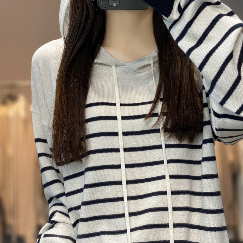 قميص تريكو مخطط بغطاء للرأس من الصوف الصوفي 24 ربيعي فضفاض بنمط كسول سترة علوية بغطاء للرأس