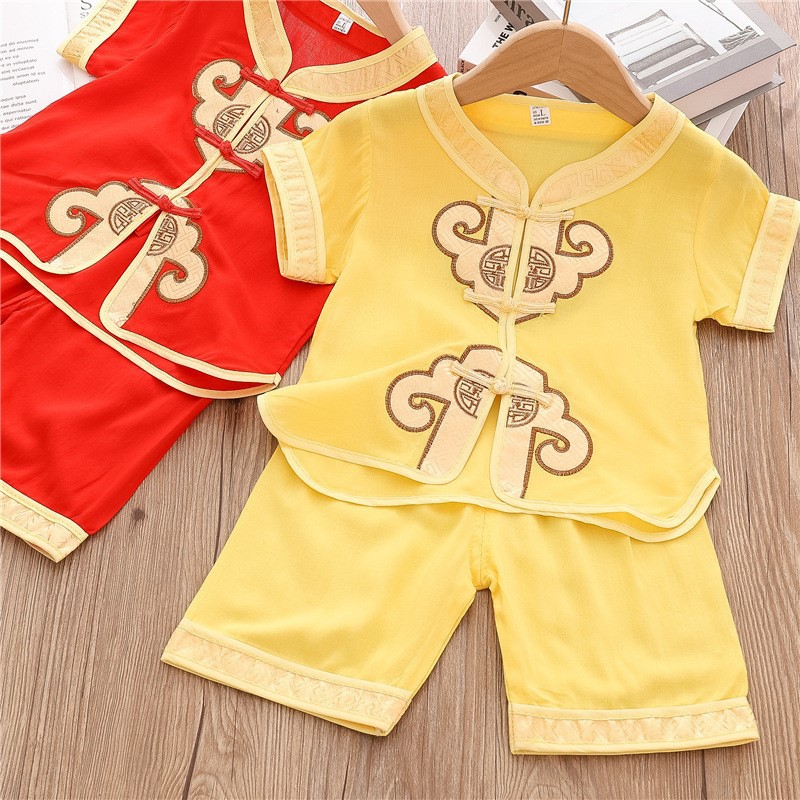 بدلة شورت للأطفال 2023 بدلة تانغ صيفية للأطفال الأولاد على الطراز الصيني ملابس للأولاد بعمر 100 عام فستان متقاطع بعمر عام واحد