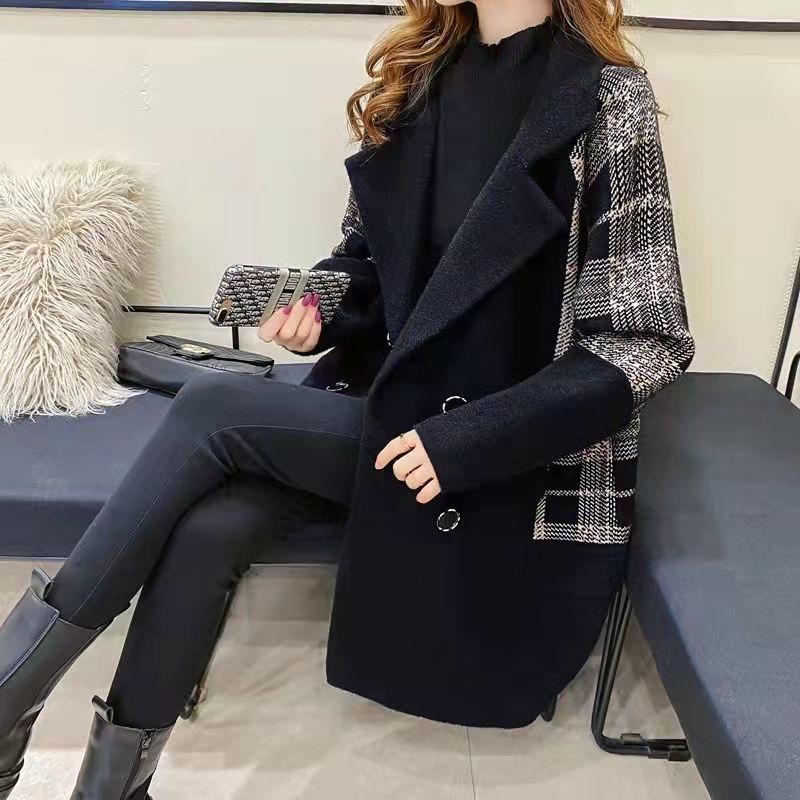 معطف منقوش من صوف المنك للنساء لخريف وشتاء 2024 معطف متوسط الطول بخياطة فضفاضة باللون الأسود من هيبورن